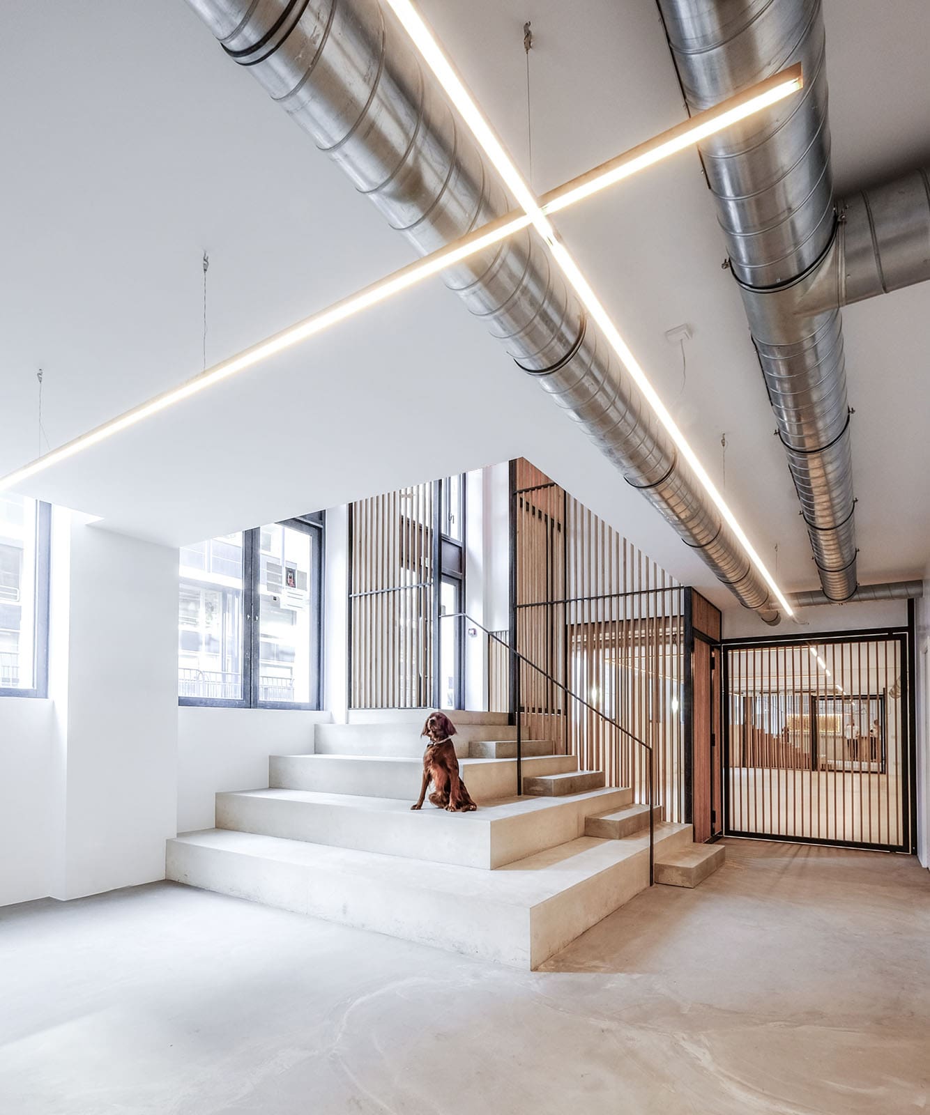 Matériaux: béton coffré, placage bois, chêne massif, laiton, métal et tôle patinée canon de fusil